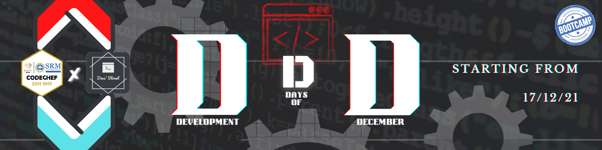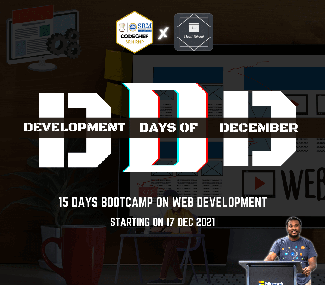 Devs' Street in Collaboration with CodeChef SRM RMP is organising DEVELOPMENT DAYS OF DECEMBER (DDD), A 15 days rigorous and dedicated bootcamp program to accelerate your learning, starting from scratch, you will get the opportunity to: